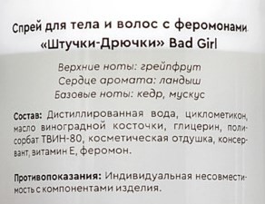 Секретное оружие твоего магнетизма – спрей “Bad Girl”, он станет твоим самым любимым косметическим средством на каждый день. Двухфазный многокомпонентный спрей содержит феромон, известный своим воздействием не только на противоположный пол. Быть плохой девочкой – это искусство, а "Bad Girl" поможет тебе в этом. Осторожно, спрей вызывает мгновенную симпатию и всплеск интереса.