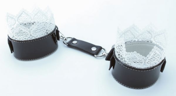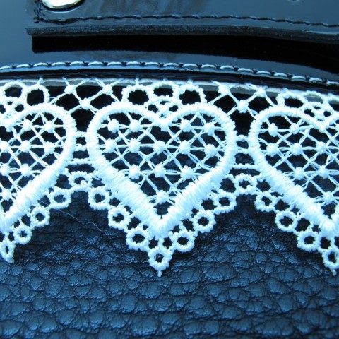 Черный ошейник с белым кружевом, изготовлен из натуральной лаковой кожи.