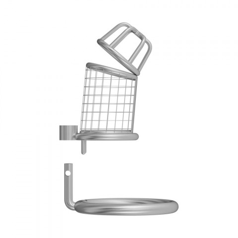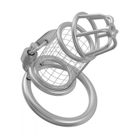 Массивный и эффектный пояс полностью закрывает половой член. Фиксируется в области основания яичек при помощи неразъемного кольца. а сама сбруя в виде клетки надевается на половой член. Вся конструкция застегивается на небольшой замок с ключами в комплекте.