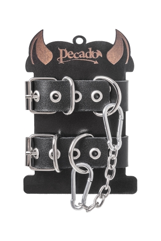 Брутальные наручники из одного ремешка от Pecado – отличный подарок партнеру к любому случаю. Во-первых, они незаменимая вещь для жестких ролевых игр. Во-вторых, отличный аксессуар-браслет на руку для повседневного и тематического look-а. Сексуальный атрибут изготовлен российским производителем. Специальная технология выделки кожи обеспечивает хорошую износостойкость. Черный материал прекрасно прилегает к телу и не оставляет следов. Подходят и мужчинам, и женщинам. Наручники декорированы большими стальными кольцами. Металлическая фурнитура высокого качества обеспечивает надежную фиксацию. Манжеты фиксируются между собой благодаря съемной, короткой цепочке. При желании ее можно заменить на другой необходимый аксессуар.
