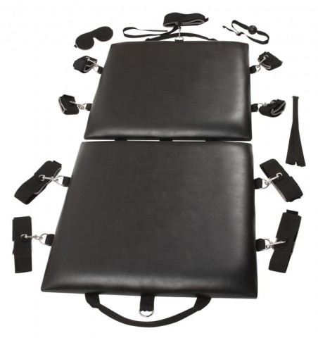 Доска для связывания складывается и имеет удобный для переноски ремень. В комплект входят различные аксессуары: мягкие манжеты для запястий и лодыжек (по 4 штуки) и чокер - все фиксаторы можно закрепить в любом месте на доске с помощью защелок. 1 кляп, 1 флоггер и 1 повязка на глаза также включены.
