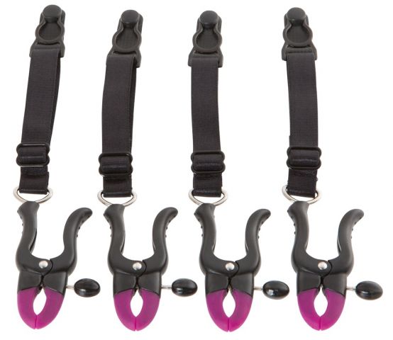 4 регулируемых ремня для подтяжки (8–12 см) с держателями и фиолетовыми зажимами для половых губ с мини-винтами для изменения степени жесткости.