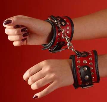 Фигурные наручи выполнены из красной кожи. Подкладка изготовлена из синтетической пены обтянутой замшей или мягкой кожей. Поверхность декорирована заклепками, окантованные кожей на подкладке.