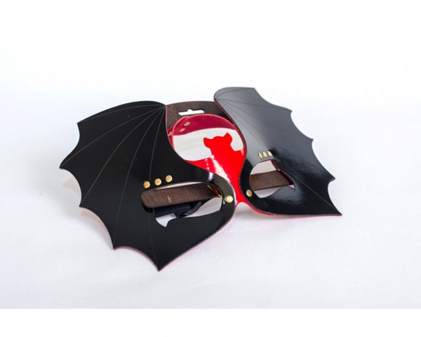 Маска изготовлена из натуральной лаковой кожи красного и черного цвета. Резинка с пряжкой позволяет регулировать изделие по размеру.