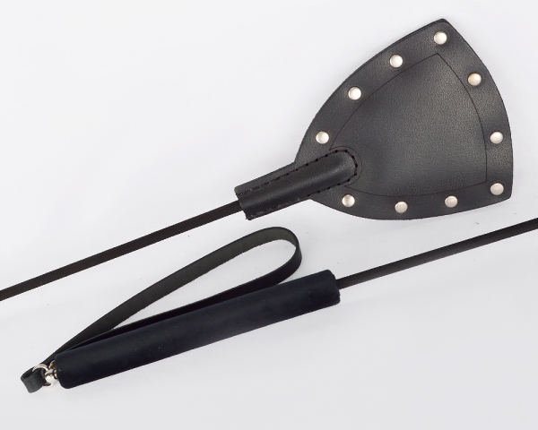 Стек и представлен в виде роскошного, изящного изделия черного цвета. Основательная хлопушка стека изготовлена из натуральной кожи высокого качества и украшена большим количеством клёпок. Хлопушку и рукоять соединяет упругий, но прочный хлыст.