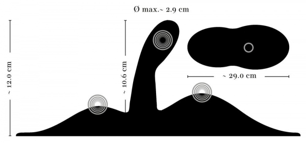 Размеры: 29 × 16,1 × 12 см, вставка вибратора — 10,6 см × Ø 2–2,9 см. Вес 446 г. Материалы: силикон, полиуретан, ABS.